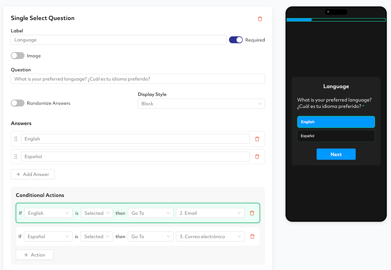 Conditional Logic Highlighting When previewing a survey, selecting an answer now highlights the conditional actions it will trigger. Verify your branching logic visually without any guesswork.