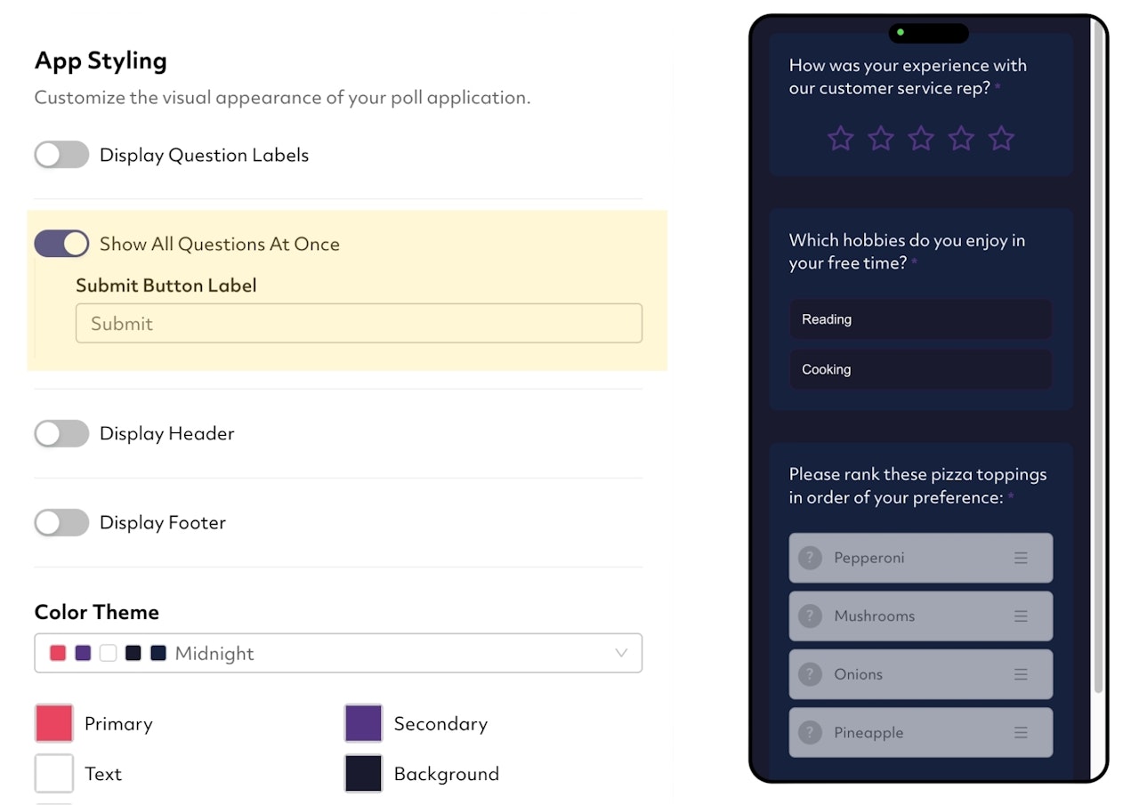 Show All Questions at Once (Single-Pane Mode) Surveys now support a "Show All Questions At Once" option. When enabled, respondents see every question on a single scrollable page with one Submit button at the bottom, instead of navigating through questions one at a time. This is ideal for shorter surveys where a quick, scroll-through experience is preferred. You can customize the Submit button label, and the builder preview lets you simulate the full experience before sending.