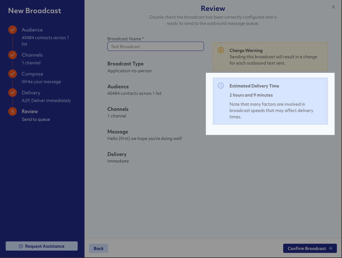 When creating a new broadcast, the platform will give an estimate for the amount of time it will take to deliver the texts to all contacts. This is an estimate only and actual results may vary significantly. The factors that are taken into account include: