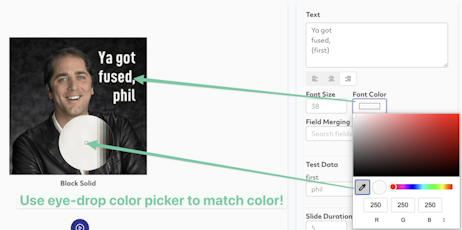 Then add text containing any data-field, such as {first}, {zip}, {donationAmount} so that your contact’s unique data gets injected directly into the image!