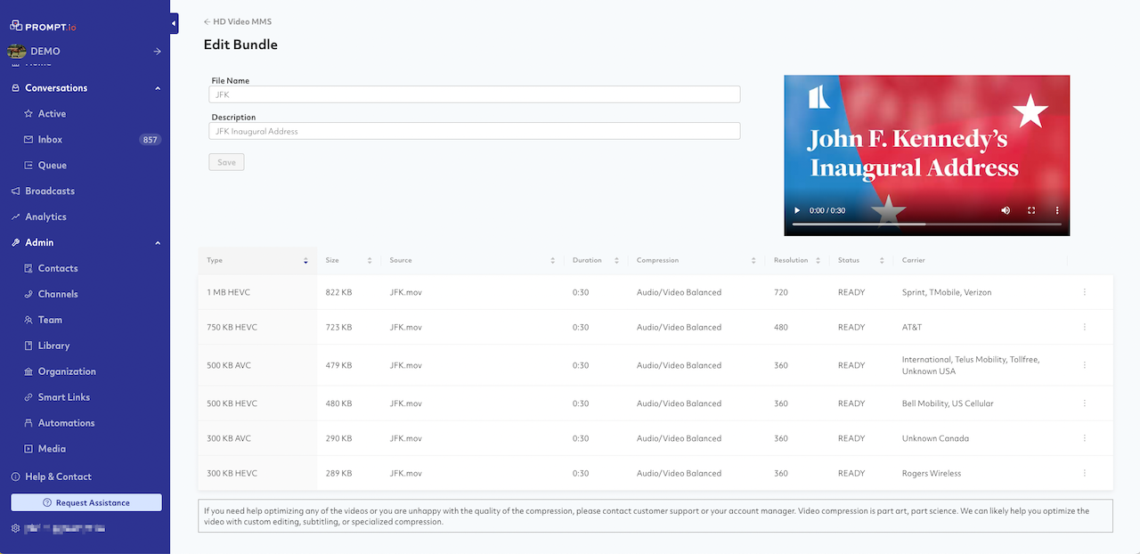 HD VIDEO MMS -- The platform will now compress videos of up to 100mb and 60 seconds in length and optimize them for delivery on a per-carrier basis. For instance, recipients on AT&T may receive a 750kb file while T-Mobile customers get a 1mb file size -- the maximum file size supported by the carrier.