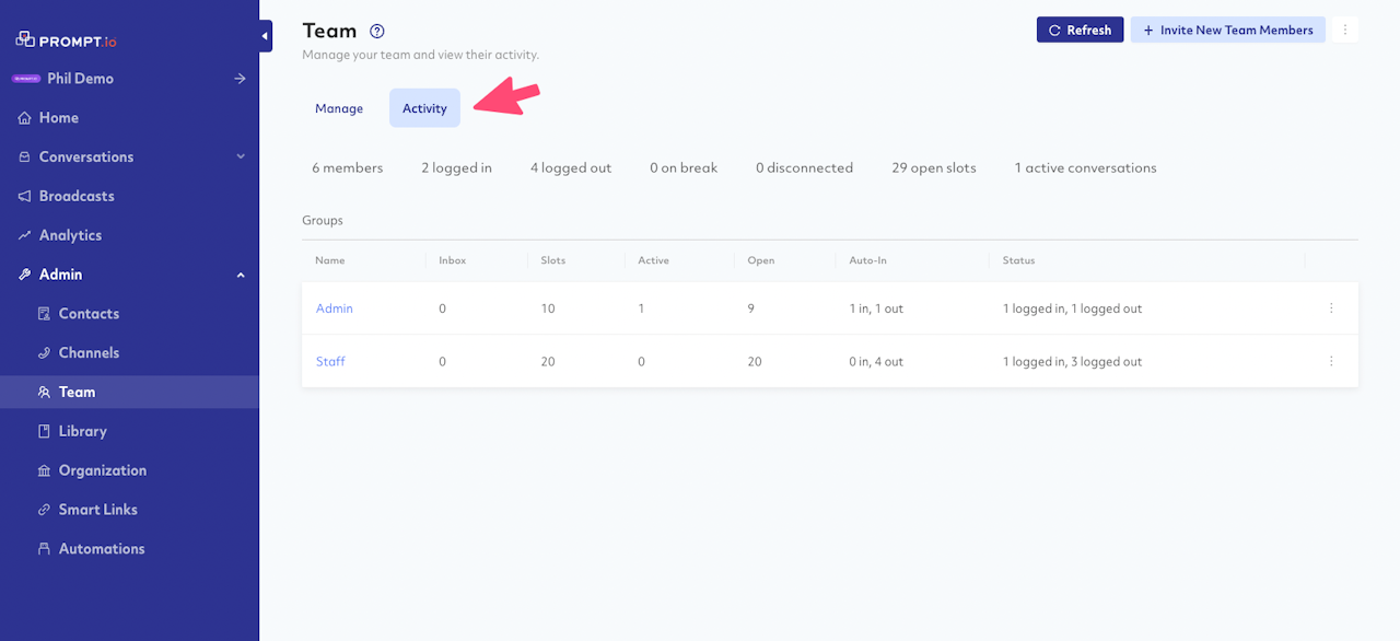 The Team Activity Monitor gives Admin users the ability to see the stats associated with all users: