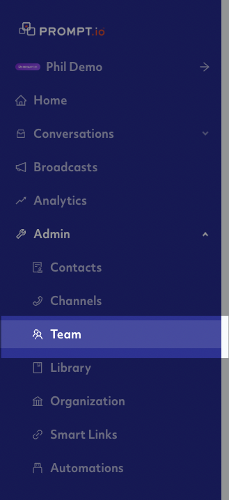 To add new Team Members to your organization, navigate to Admin -> Team.