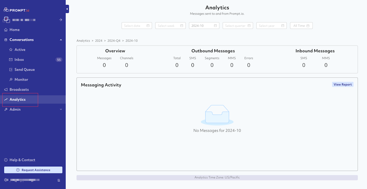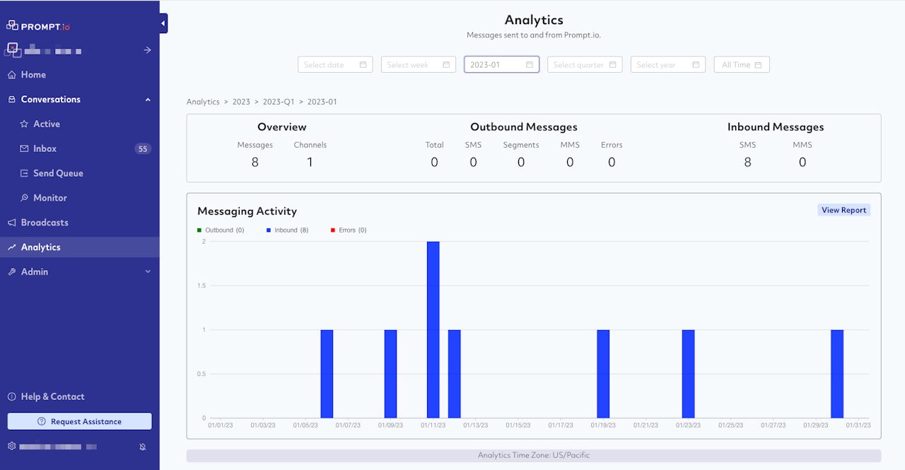 The Analytics page displays messages sent to and from Prompt.io. The table displays a date-by-date number of inbound messages, outbound messages and the sources for the outbound messages.