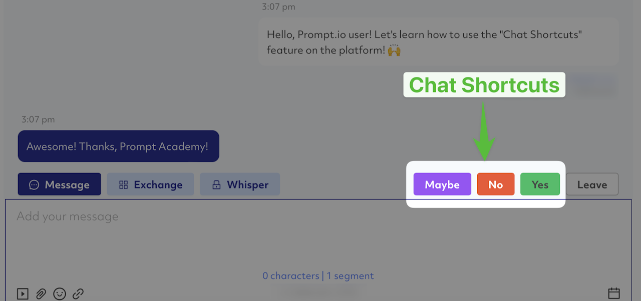 Prompt.io Chat Shortcuts allow users quick access to commonly used responses. You can configure any library action to appear as a Chat Shortcut within the conversation toolbar.