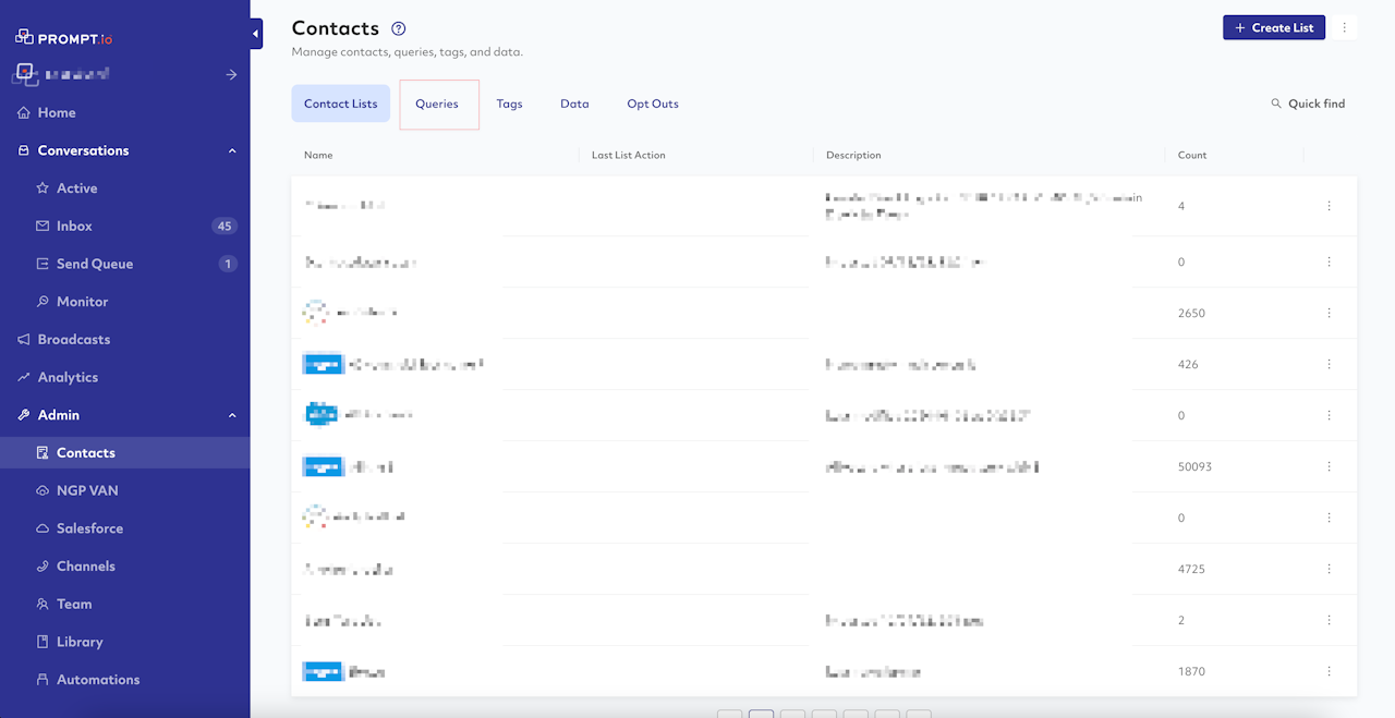 Contact Query gives organizations the ability to search through the contacts and find all matches to given criteria. These matches can be saved to a Contact List, exported to a csv, or even used directly for a Broadcast.