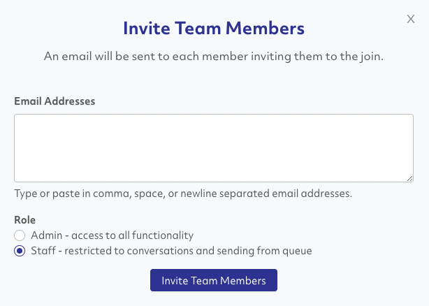 Enter email addresses for your team members. Invite multiple team members by separating addresses with a comma, space, or add each on a separate line in the dialog.