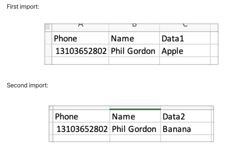 After the first and second import, the contact would now have both data fields attached to their record, both Data1 = Apple and Data2 = Banana.