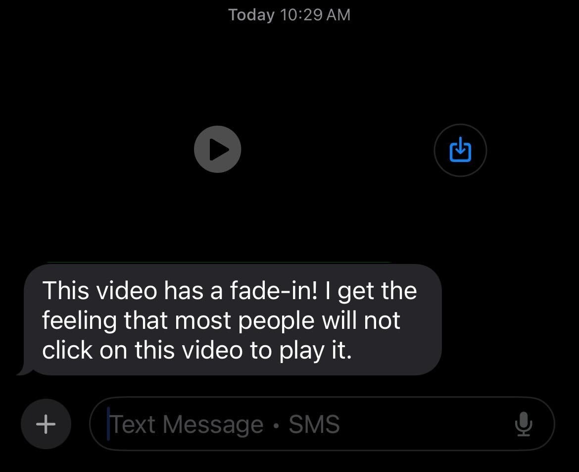In the conversation thread, for modern mobile handsets, the thumbnail will always be whatever the first frame of the video happens to be. Often, it’s a boring intro slide, or a blank frame, due to many videographers/producers opting for a “fade-in” at the beginning of the video. This is definitely NOT an enticing video thumbnail.