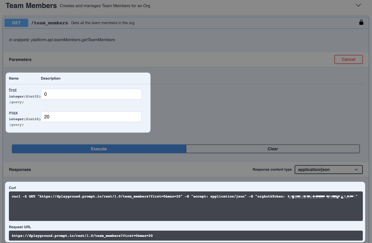 Let's try a simple call: find the GET call for /team_members, click it to expand, and click "Try it out." By default, the fields are set to pull all of the first 20 agents on the team. You can widen this search by setting the max field to a higher number.