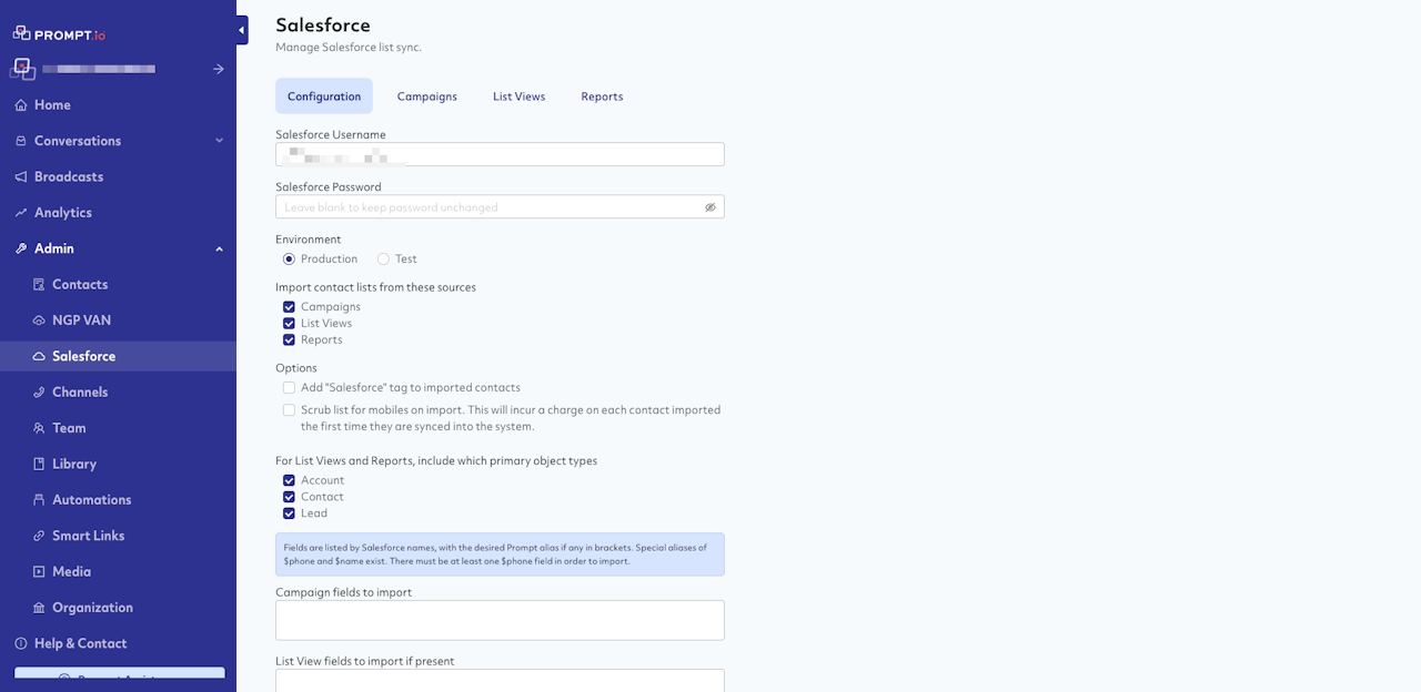 Prompt UI now provides a Salesforce page where the user can select a source to import contacts from a list type, select primary objects (Lists and Reports), and select a field to import.