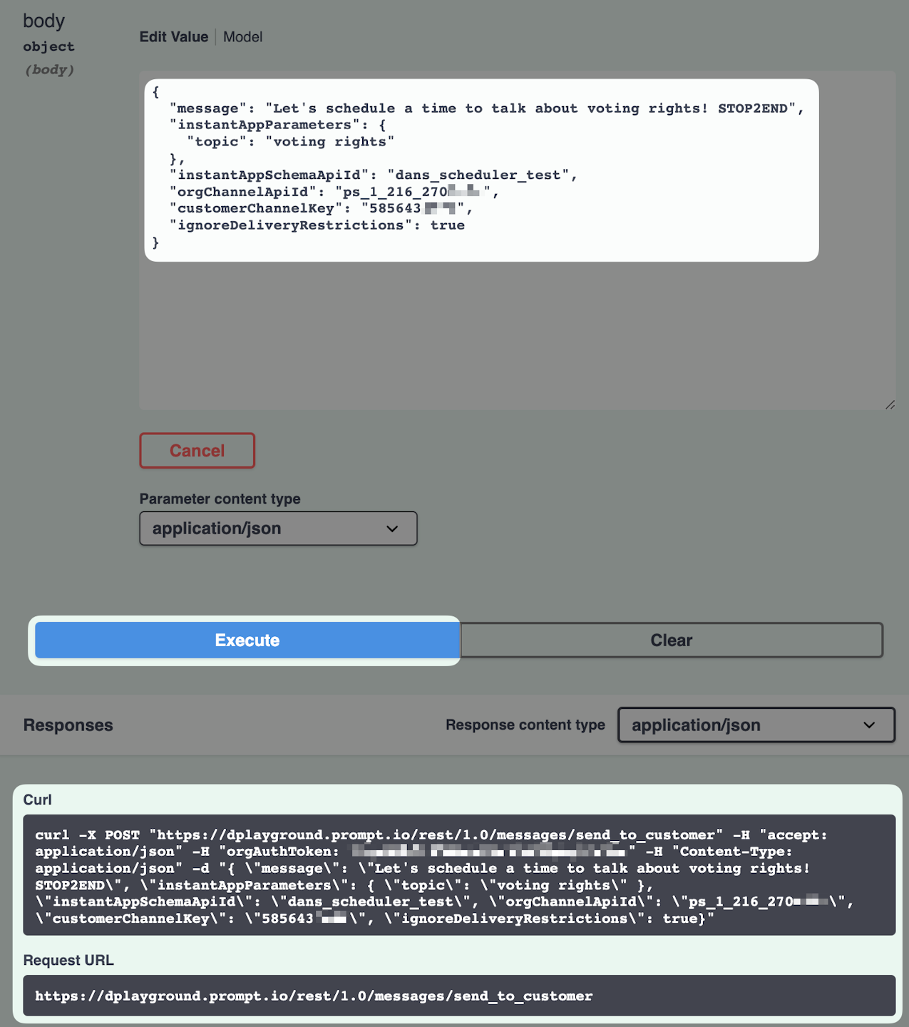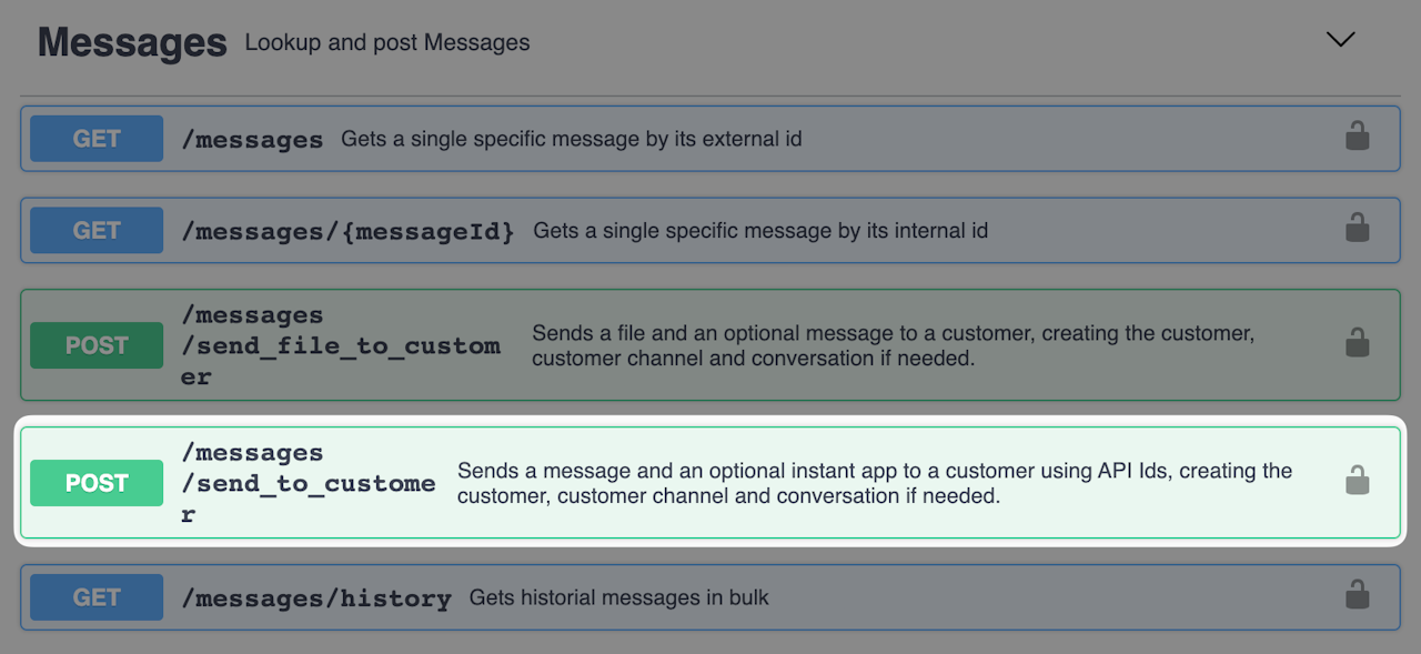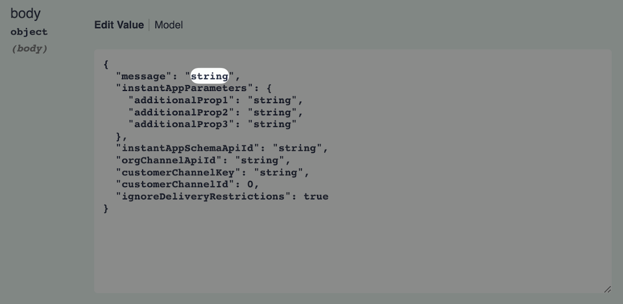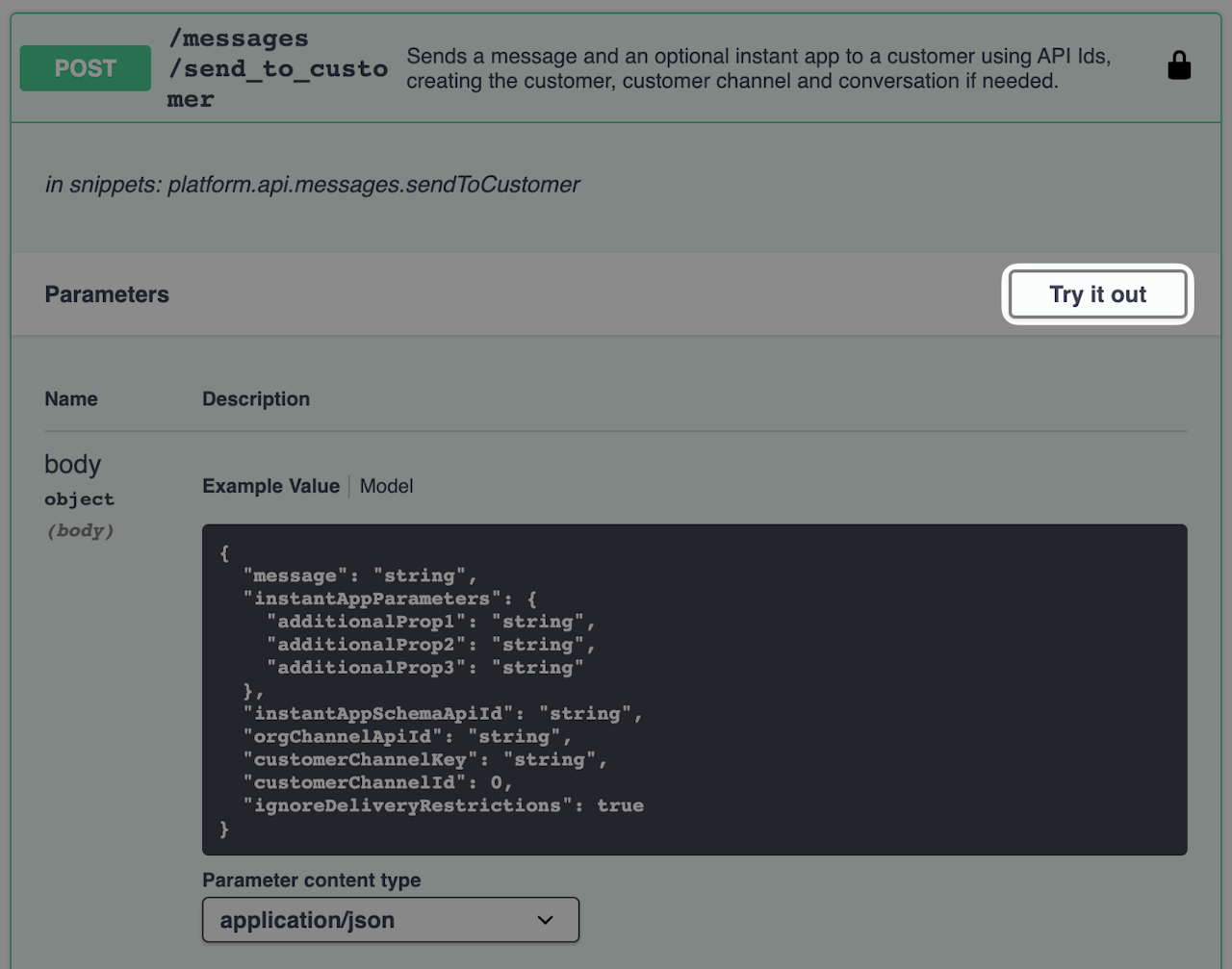 On your swagger page, locate /messages/send_to_customer under the Messages section, and click to expand it. Click "Try it out." We're going to edit the JSON key values with the necessary information to send an Instant App and message to a mobile user.