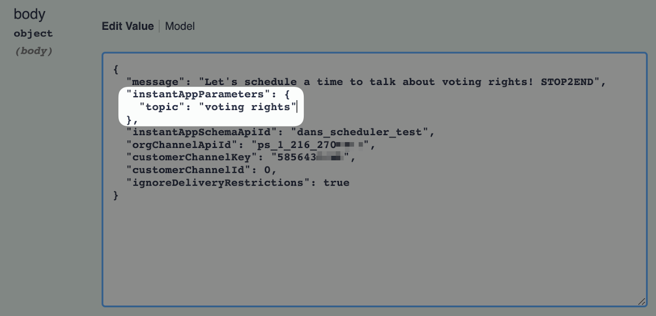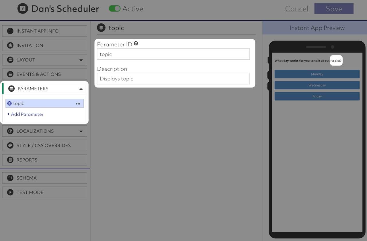 Then in our Instant App, if we provide a parameter with the Parameter ID "topic," any time the Instant App sees the variable