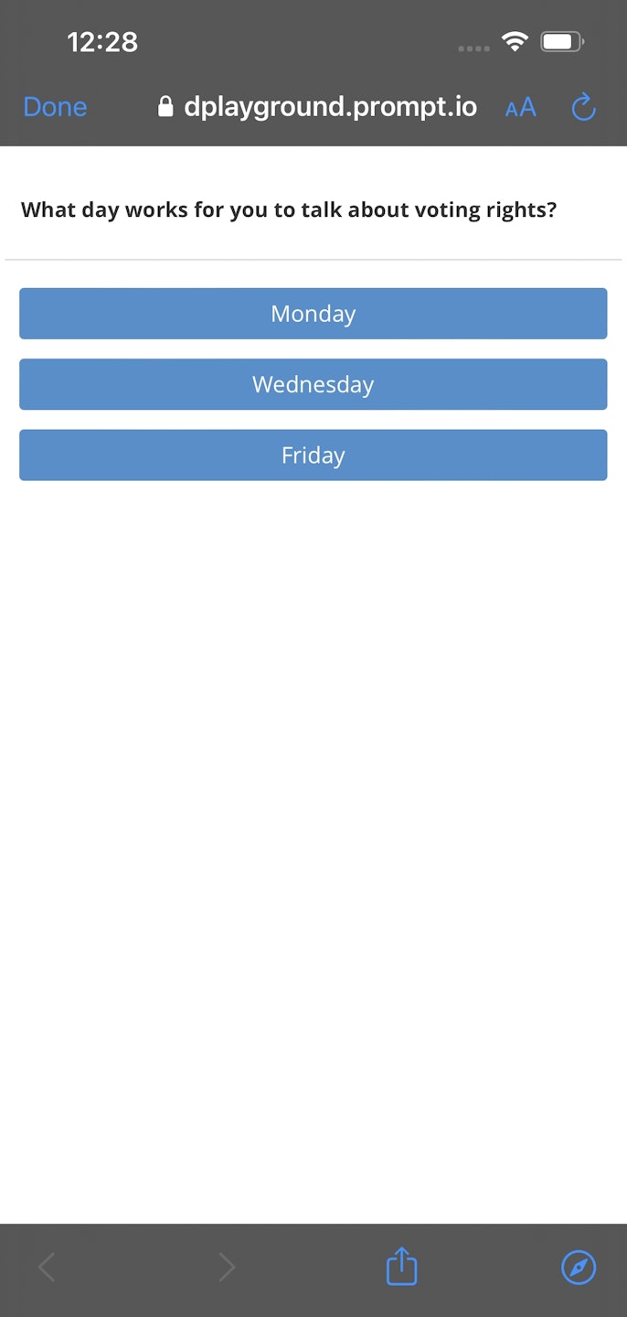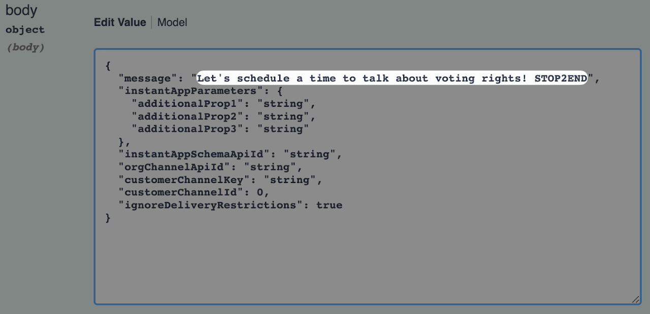In this example, we're going to send our contacts an Instant App designed to schedule meetings to talk about specific topics—in this case, the topic will be voting rights. Let's set our message to something that will prompt our contact to click on our instant app link!