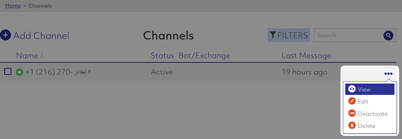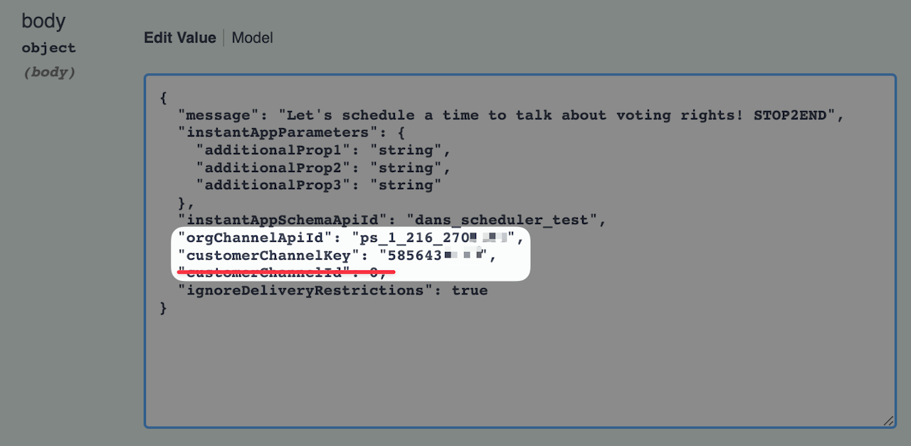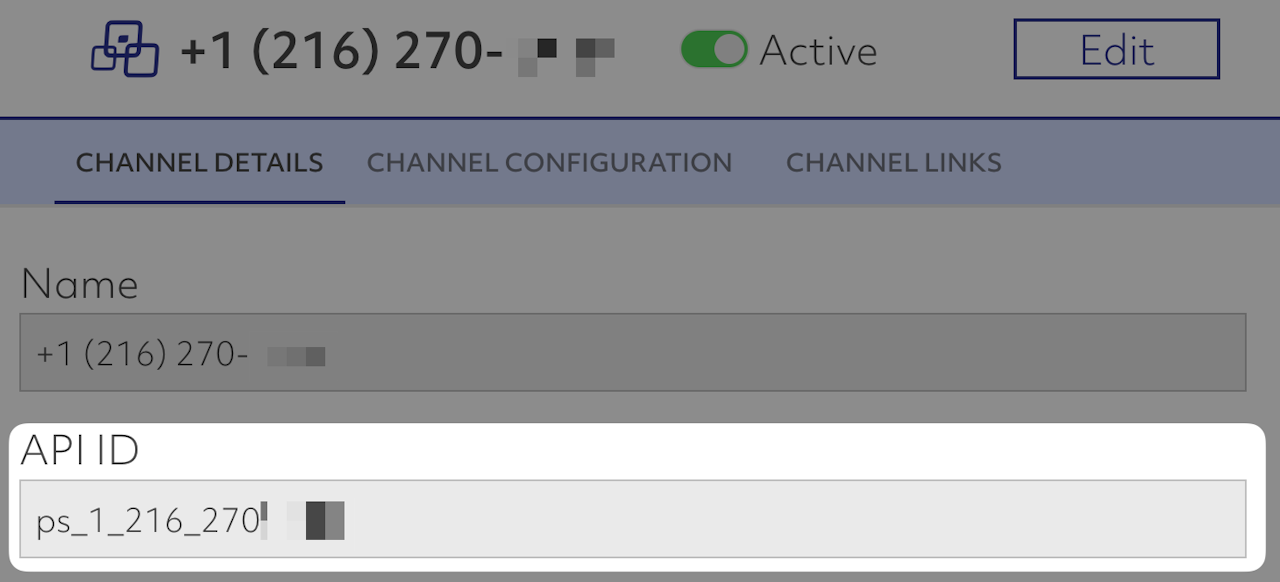 Think of this as a unique string that represents one of the organization's purchased phone numbers. To find this value, go to your Full Suite dashboard, then Channels, then locate the desired channel, click the ellipses on the right-side, then view, then copy the orgChannelApiId from the API ID field.