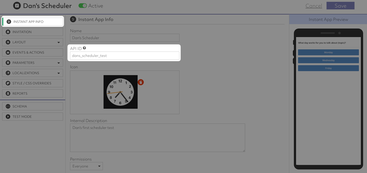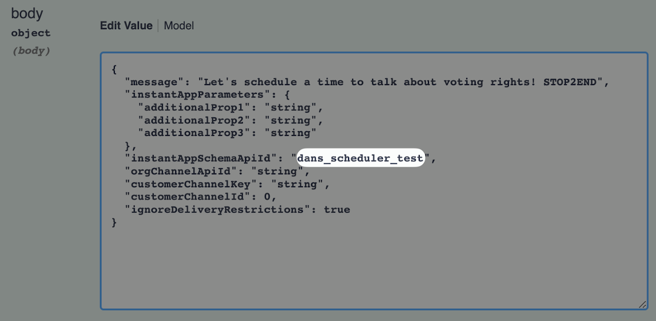 Next we're going to choose the Instant App we wish to send to our contact and copy-paste in its instantAppSchemaApiId. To locate the instantAppSchemaApiId of your Instant App, go to your organization's Full Suite dashboard, click Instant Apps, then choose the desired Instant App, and locate the API ID field under the Instant App Info tab.