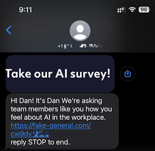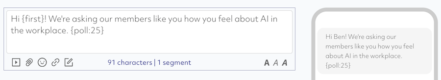 From within the platform, you'll see a reference to the poll in curly braces, but when the text goes out, our system will generate a unique link for each individual on whatever custom domain was configured for the organization.