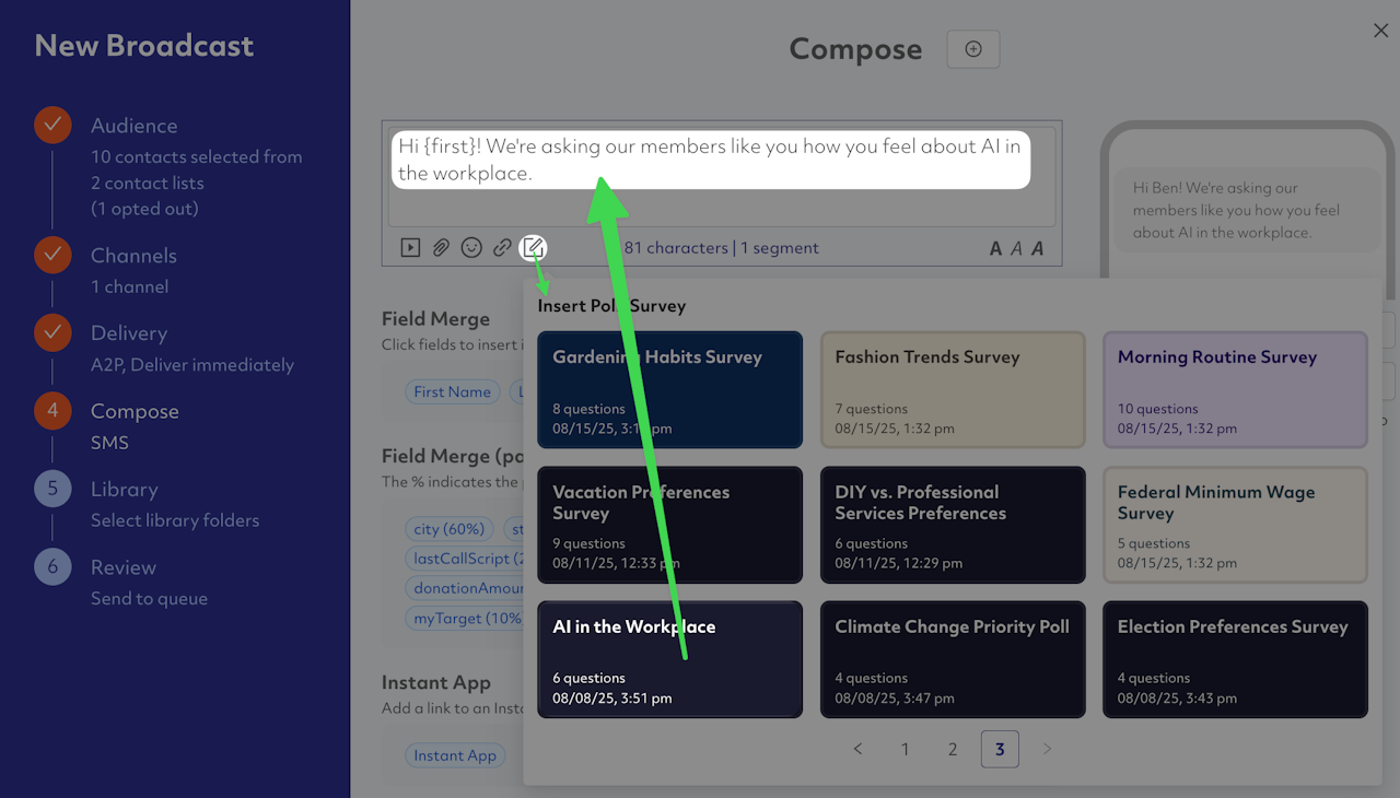 To get results at scale, send it in a broadcast by clicking the last icon in the message composer, and selecting the desired poll from your list of active polls.