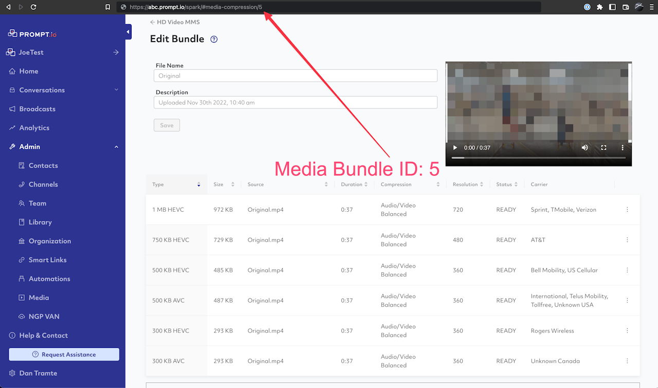 Now back in Spark, each video you upload in the Prompt.io Media pane will turn into a collection of copies of that video, compressed to different sizes called a "Media Bundle." Before we can set the thumbnail for that video, we need to first locate the ID of the media bundle. This can be found in the URL of the Media Bundle (see image)