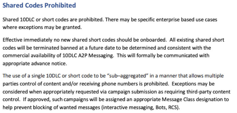 As a result, the use of shared short codes is now considered non-compliant at the carrier level. Here is the exact language used by ATT in a recent communication: